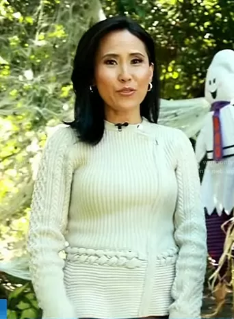 Vicky Nguyen on Today on NBC was spotted wearing this ivory ribbed knit jacket on Today on Oct 28 2022's episode. Vicky's Jacket is the Andi Fisherman Knit Peplum Jacket by Jonathan Simkhai.