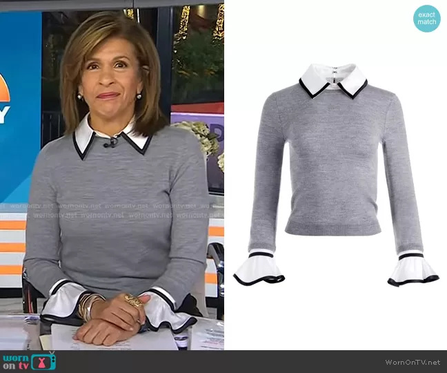 Hoda Kotb on Today on NBC was spotted wearing this grey collared sweater on Today on Oct 28 2022's episode. Hoda's Sweater is the Justina Mixed Media Pullover by Alice + Olivia.