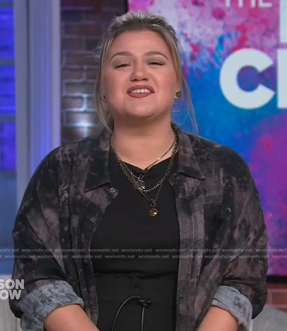 Kelly Clarkson on The Kelly Clarkson Show on NBC was spotted wearing this black tie dye shirt on The Kelly Clarkson Show on Oct 28 2022's episode. Kelly's Top is the Oversized Plaid Shirt by R13.
