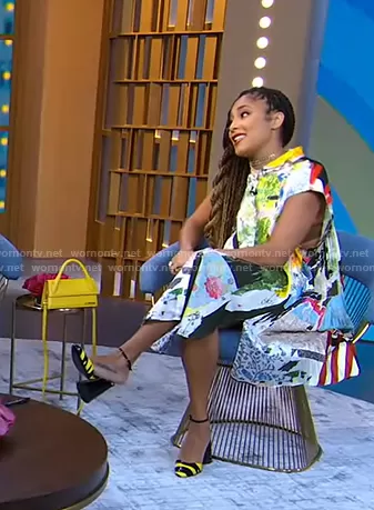 on Good Morning America on ABC was spotted wearing this mixed print dress on Good Morning America on Oct 28 2022's episode. 's Dress is the Collage-Print Sleeveless Shirt by Monse . 's Bag is the Le Chiquito Long Leather Tote by Jacquemus.