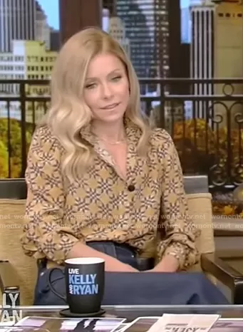 Kelly Ripa on Live with Kelly and Mark on Disney ABC Home Entertainment was spotted wearing this yellow printed blouse and jeans on Live with Kelly and Ryan on Oct 28 2022's episode. Kelly's Top is the Printed Silk crepe de chine Blouse by Isabel Marant . Kelly's Pants is the Leather-Patch High-Rise Flared Jeans by Paco Rabanne . Kelly's Shoes is the Suede Point-Toe Pump by Gianvito Rossi.