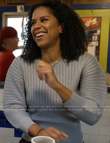 Adriana Diaz on CBS Mornings on CBS was spotted wearing this grey sweater on CBS Mornings on Oct 31 2022's episode. Adriana's Sweater is the Fancy Rib Crew in Quarry by Club Monaco .