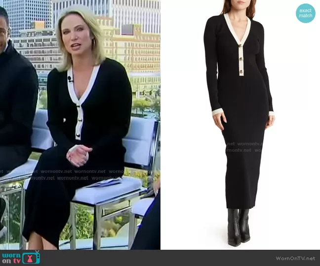Amy Robach on Good Morning America on ABC was spotted wearing this black contrast v-neck dress on Good Morning America on Oct 31 2022's episode. Amy's Dress is the Mirella Long Sleeve Sweater Dress by Ronny Kobo.