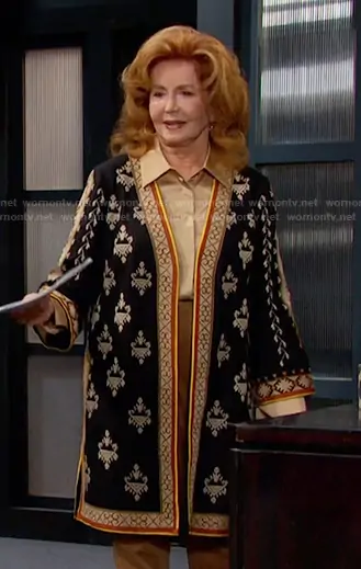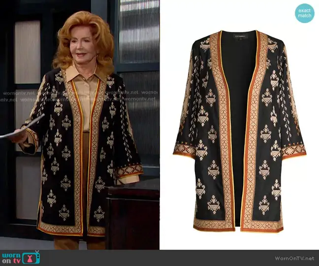 Maggie Horton (played by Suzanne Rogers) on Days of our Lives on Peacock was spotted wearing this black embroidered jacket on Days of our Lives on Nov 11 2025's episode. Maggie's Coat is the Rowen Embroidered Linen-Blend Coat by Kobi Halperin.