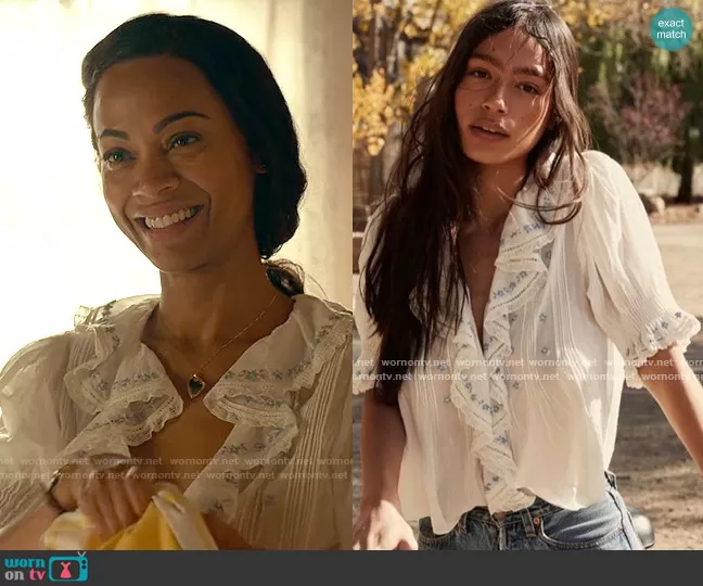 Amy Wheeler (played by Zoe Saldana) on From Scratch on Netflix was spotted wearing this white embroidered ruffle top on From Scratch on episode 'Aftertastes' (1x08) in Nov 2022. Amy's Top is the Hettie Top in Salt Blue by Doen.