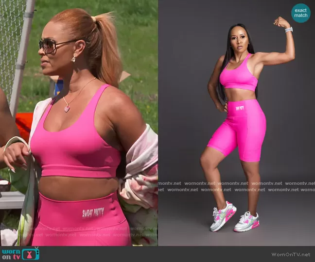 Gizelle Bryant on The Real Housewives of Potomac on Bravo was spotted wearing this pink sports bra and leggings on The Real Housewives of Potomac on episode 'Not All Fun and Games' (7x04) in Oct 2022. Gizelle's Set is the Breast Cancer Awareness Set by Sweat Pretty.
