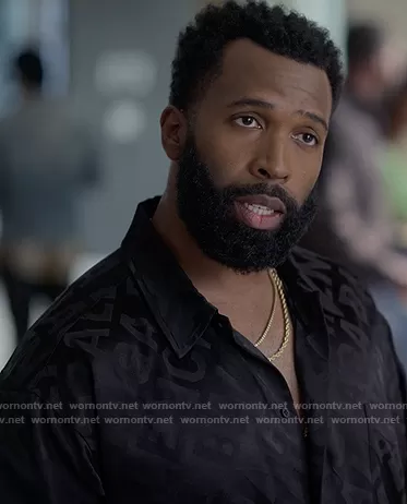 (played by ) on Reasonable Doubt on Hulu was spotted wearing this Black satin Balenciaga shirt on Reasonable Doubt on episode 'N**** What, N**** Who' (1x07) in Nov 2022. 's Shirt is the Logo-print satin shirt by Balenciaga.