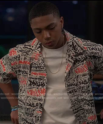 (played by Thaddeus J. Mixson) on Reasonable Doubt on Hulu was spotted wearing this white graphiti print shirt on Reasonable Doubt on episode 'N**** What, N**** Who' (1x07) in Nov 2022. 's Shirt is the Movan Shirt by Daily Paper.