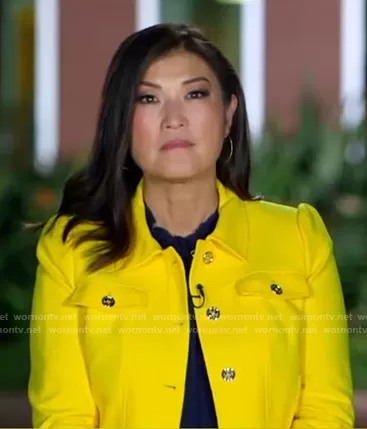 on Good Morning America on ABC was spotted wearing this yellow jacket on Good Morning America on Apr 21 2023's episode. 's Jacket is the Puff-Sleeve Trucker Jacket by Tommy Hilfiger.
