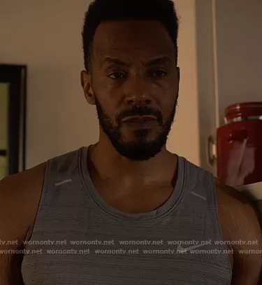 (played by McKinley Freeman) on Reasonable Doubt on Hulu was spotted wearing this gray nike tank on Reasonable Doubt on episode 'N**** What, N**** Who' (1x07) in Nov 2022. 's Shirt is the Running miler tank top in gray by Nike.