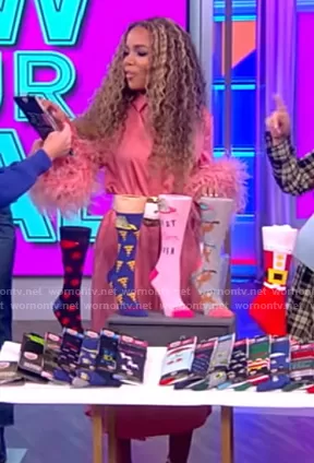 Sunny Hostin on The View on ABC was spotted wearing this pink feather cuff dress on The View on Nov 10 2022's episode. Sunny's Dress is the Feather-trim buttoned shirt dress by Lapointe.