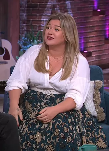 Kelly Clarkson on The Kelly Clarkson Show on NBC was spotted wearing this teal green floral skirt on The Kelly Clarkson Show on Nov 01 2022's episode. Kelly's Skirt is the Meja Skirt by Ulla Johnson . Kelly's Belt is the GG Marmont Leather Belt by Gucci.