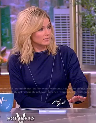 Sara Haines on The View on ABC was spotted wearing this blue contrast stitch dress on The View on Nov 02 2022's episode. Sara's Dress is the Asymmetric Chain-Link Mini Wrap Dress by JW Anderson.