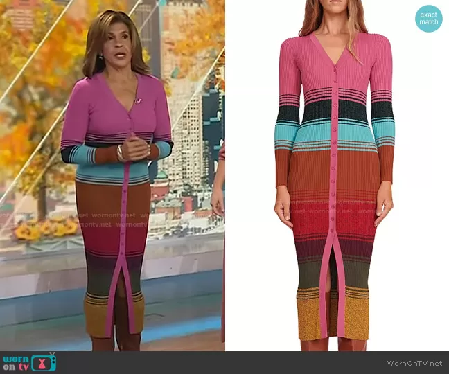 Hoda Kotb on Today on NBC was spotted wearing this multicolor stripe ribbed dress on Today on Nov 02 2022's episode. Hoda's Dress is the Shoko Sweater in Mosaic Stripe by Staud . Hoda's Shoes is the Nedema Pointed Western Boot by Vince Camuto.