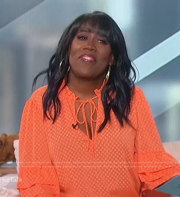 Sheryl Underwood on The Talk on CBS was spotted wearing this orange bell sleeve blouse on The Talk on Nov 02 2022's episode. Sheryl's Top is the Julius Textured Tiered-Sleeve Top by Alice + Olivia.
