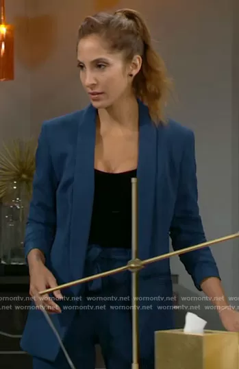 Lily Winters (played by Christel Khalil) on The Young and the Restless on CBS was spotted wearing this teal blue suit on The Young and the Restless on Nov 03 2022's episode. Lily's Jacket is the Shawl Collar Blazer by DKNY . Lily's Pants is the Tie Waist Pants by DKNY.