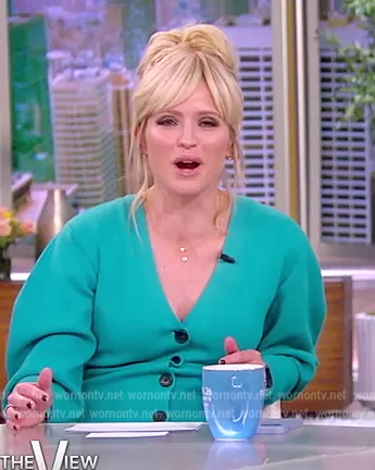 Sara Haines on The View on ABC was spotted wearing this blue turquoise button down mini dress on The View on Nov 04 2022's episode. Sara's Dress is the Nate Button Front Sweater Dress by A.L.C..