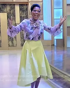 Tamron Hall on Tamron Hall Show on ABC was spotted wearing this floral print blouse and skirt on Tamron Hall Show on Nov 04 2022's episode. Tamron's Top is the Sheer Passionflower & Tie-Neck Blouse by Oscar de la Renta . Tamron's Skirt is the Asymmetric-hem leather midi skirt by Bottega Veneta.