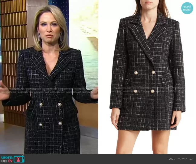 Amy Robach on Good Morning America on ABC was spotted wearing this black plaid blazer dress on Good Morning America on Nov 04 2022's episode. Amy's Dress is the Lily Plaid Double Breasted Jacket by Ronny Kobo.