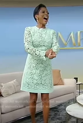 Tamron Hall on Tamron Hall Show on ABC was spotted wearing this mint lace mini dress on Tamron Hall Show on Nov 04 2022's episode. Tamron's Dress is the Lace Long-Sleeve Minidress by Giambattista.