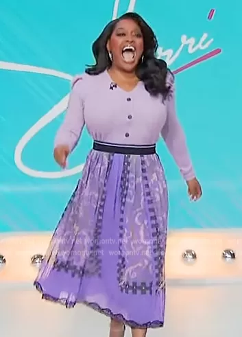 Sherri Shepherd on Sherri on FOX was spotted wearing this lavender cardigan and skirt on Sherri on Nov 04 2022's episode. Sherri's Sweater is the Puff Sleeve Cashmere Cardigan by Saks Fifth Avenue . Sherri's Skirt is the x Koche Selva print pleated skirt by Emilio Pucci.