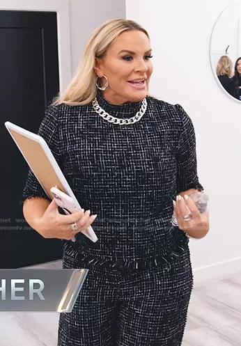 Heather Gay on The Real Housewives of Salt Lake City on Bravo was spotted wearing this black check top and pants on The Real Housewives of Salt Lake City on episode 'Finsta Fight' (3x06) in Nov 2022. Heather's Top is the Textured Top by Zara . Heather's Pants is the Textured Wide Leg Pants by Zara.