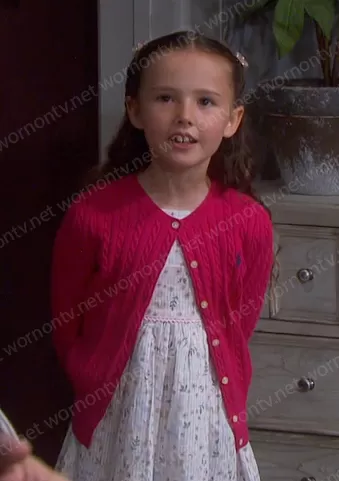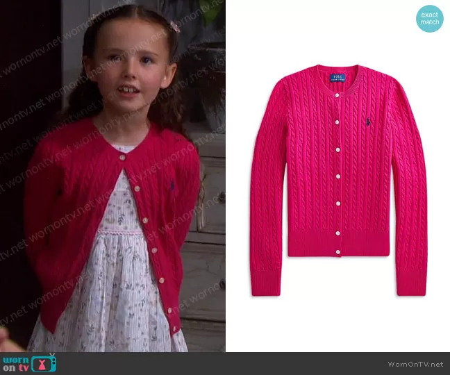 Rachel Black (played by Finley Rose Slater) on Days of our Lives on Peacock was spotted wearing this pink cardigan on Days of our Lives on Nov 05 2022's episode. 's Sweater is the Girls' Cable Knit Cotton Cardigan by Polo Ralph Lauren.
