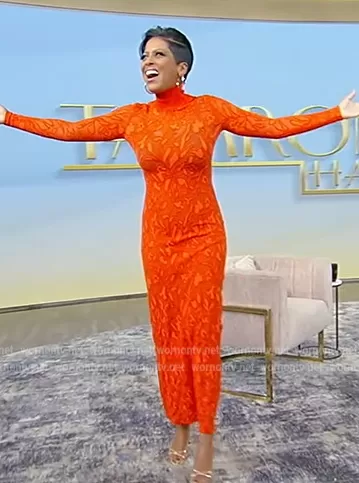 Tamron Hall on Tamron Hall Show on ABC was spotted wearing this red floral lace dress on Tamron Hall Show on Nov 07 2022's episode. Tamron's Dress is the Stretch lace Collared Bodycon Maxi Dress by Alaia.