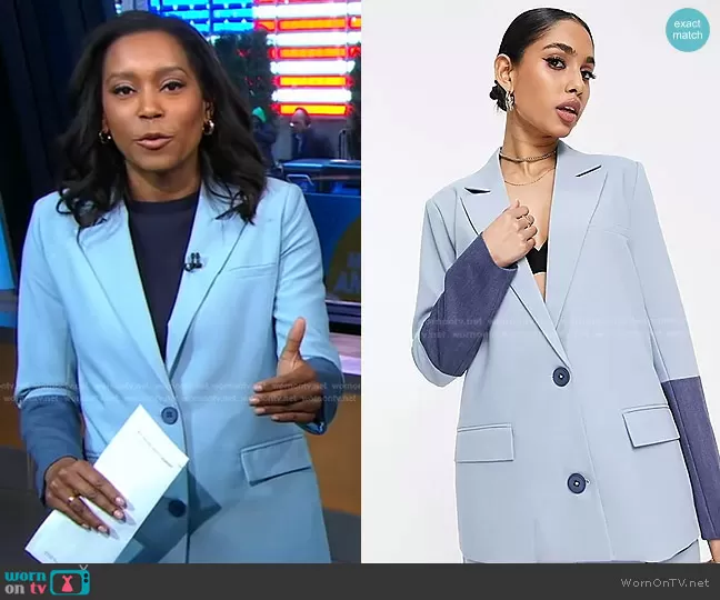 Rachel Scott on Good Morning America on ABC was spotted wearing this blue colorblock blazer and pants on Good Morning America on Apr 12 2023's episode. Rachel's Jacket is the Tailored Suit Jacket in color block blue by 4th & Reckless . Rachel's Pants is the Tailored Pants in color block blue by 4th & Reckless.