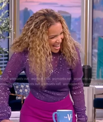 Sunny Hostin on The View on ABC was spotted wearing this purple metallic top and pants on The View on Nov 07 2022's episode. Sunny's Top is the Sequined Mesh Turtleneck Top by LaQuan Smith . Sunny's Pants is the High-Rise Wide-Leg Signature Pants by Sergio Hudson.