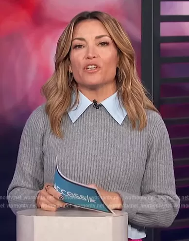 Kit Hoover on Access Hollywood on NBC was spotted wearing this grey ribbed mixed media sweater on Access Daily on Jan 13 2023's episode. Kit's Sweater is the Layered Crop Wool Sweater by Sandro.