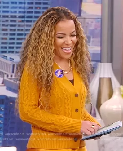 Sunny Hostin on The View on ABC was spotted wearing this yellow cable knit cardigan on The View on Nov 08 2022's episode. Sunny's Sweater is the Braided Cable Cardigan by Vince . Sunny's Skirt is the Side Slit Slip Skirt by Vince.