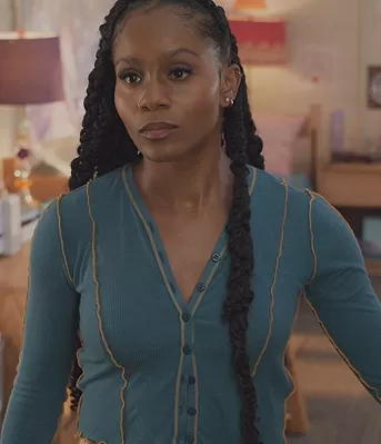 Simone (played by Geffri Hightower) on All American Homecoming on CWTV was spotted wearing this blue contrast piping cardigan on All American Homecoming on episode 'We Shall Not Be Moved' (2x04) in Nov 2022. Simone's Sweater is the T-Ribyel Open Cardigan by Diesel.