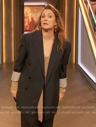 Drew Barrymore on The Drew Barrymore Show on CBS was spotted wearing this pinstripe blazer and tie neck blouse on The Drew Barrymore Show on Nov 09 2022's episode. Drew's Top is the Neck-Tie Silk Georgette Blouse by Valentino . Drew's Blazer is the Jude Jacket by Celine . Drew's Pants is the Kitty Pants by Celine.