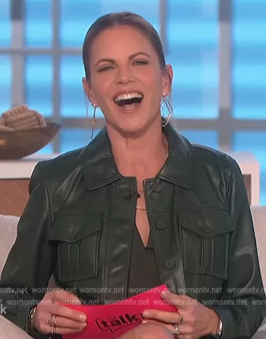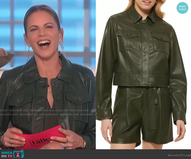 Natalie Morales on The Talk on CBS was spotted wearing this green leather jacket on The Talk on Nov 09 2022's episode. Natalie's Jacket is the Faux Leather Short Jacket by DKNY . Natalie's Shorts is the Tie Faux Leather High Waist Shorts by DKNY.