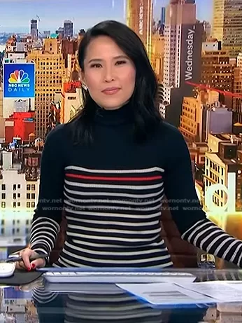 Vicky Nguyen on NBC News Daily on NBC was spotted wearing this striped knit dress on NBC News Daily on Sep 25 2023's episode. Vicky's Dress is the Kate Stripe Turtleneck Mini Dress by Rag & Bone.
