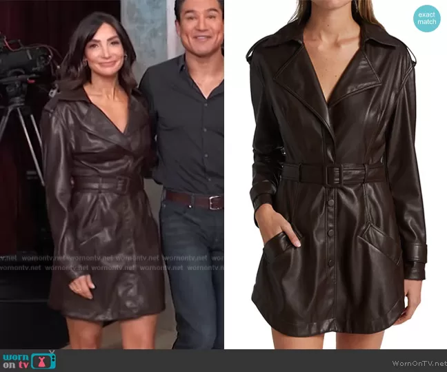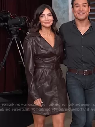 on Access Hollywood on NBC was spotted wearing this brown leather wrap dress on Access Daily on Nov 09 2022's episode. 's Dress is the Chandler Vegan Leather Trench Mini Dress by Jonathan Simkhai.
