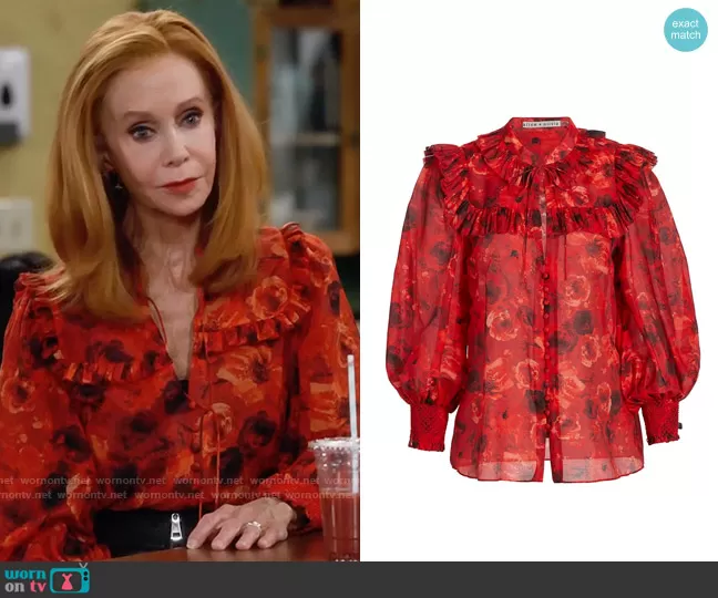 Sheila (played by Swoosie Kurtz) on Call Me Kat on Fox was spotted wearing this red floral blouse with ruffles on Call Me Kat on episode 'Call Me the Hot Chick Two' (3x06) in Nov 2022. Sheila's Top is the Bette Blouse in Oceanside Floral Ruby by Alice + Olivia.