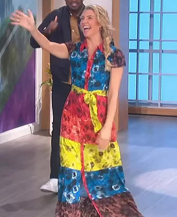Amanda Kloots on The Talk on CBS was spotted wearing this multi-colored print maxi dress on The Talk on Nov 10 2022's episode. Amanda's Dress is the Miranda Tiered Maxi Dress by Alice + Olivia.