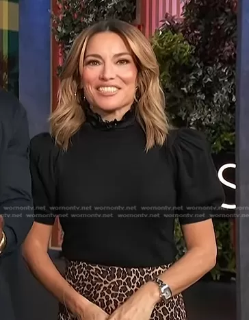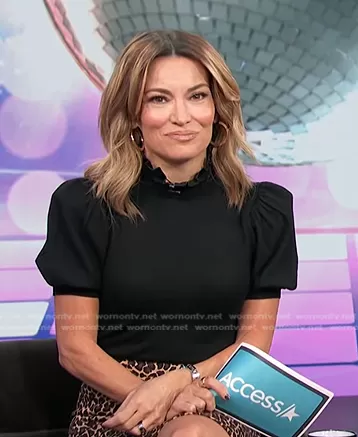 Kit Hoover on Access Hollywood on NBC was spotted wearing this black puff sleeve top on Access Hollywood on Oct 31 2023's episode. Kit's Sweater is the Chase Puff Sleeve Ruffle Neck Sweater by Alice + Olivia .