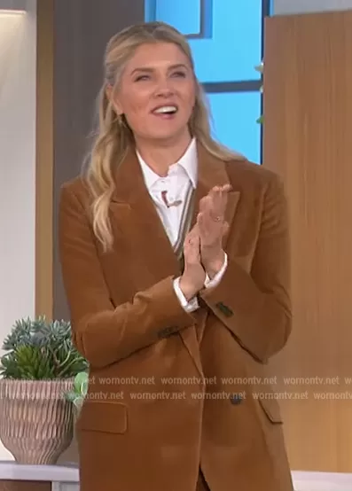 Amanda Kloots on The Talk on CBS was spotted wearing this brown corduroy blazer on The Talk on Apr 24 2023's episode. Amanda's Blazer is the Corduroy Blazer by Frame . Amanda's Pants is the Corduroy Flare Hem Pants by Frame.