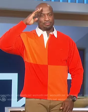 Akbar Gbajabiamila on The Talk on CBS was spotted wearing this orange two-tone rugby shirt on The Talk on Nov 11 2022's episode. Akbar's Shirt is the Organic cotton rugby polo shirt by Sandro.