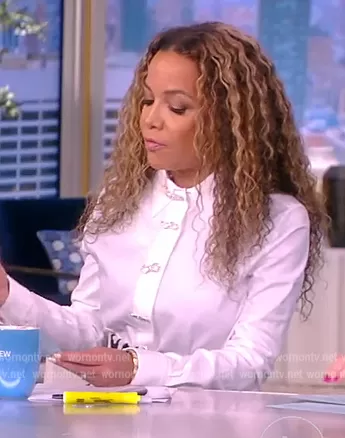 Sunny Hostin on The View on ABC was spotted wearing this white embellished bow blouse and skirt on The View on Nov 11 2022's episode. Sunny's Top is the Crystal Bow Cotton Button-Up Shirt by Mach & Mach . Sunny's Skirt is the The Stream Cotton Midi-Skirt by Johanna Ortiz.