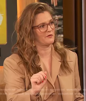 Drew Barrymore on The Drew Barrymore Show on CBS was spotted wearing this beige silk blouse and blazer on The Drew Barrymore Show on Nov 11 2022's episode. Drew's Top is the Crepe De Chine Blouse by Saint Laurent . Drew's Blazer is the Wool flannel blazer by Stella Mccartney.
