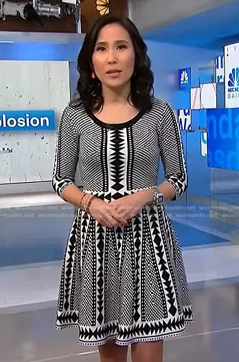 Vicky Nguyen on NBC News Daily on NBC was spotted wearing this Vicky’s black and white geometric print dress on NBC News Daily on Nov 14 2022's episode. Vicky's Dress is the Geometric Print Sweater Dress by Nina Leonard.