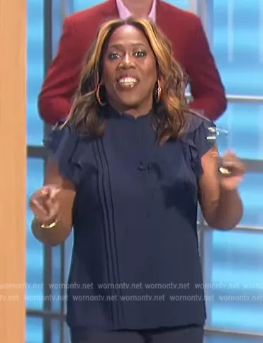 Sheryl Underwood on The Talk on CBS was spotted wearing this navy pleated ruffle top on The Talk on Jan 02 2023's episode. Sheryl's Top is the Pintuck Ruffled Blouse by Cece.