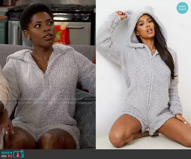 Necie (played by Chelsea Harris) on The Neighborhood on CBS was spotted wearing this grey teddy romper on The Neighborhood on episode 'Welcome to the Working Week' (5x07) in Nov 2022. Necie's Romper is the Grey Teddy Ear Borg Romper by Pretty Little Thing.