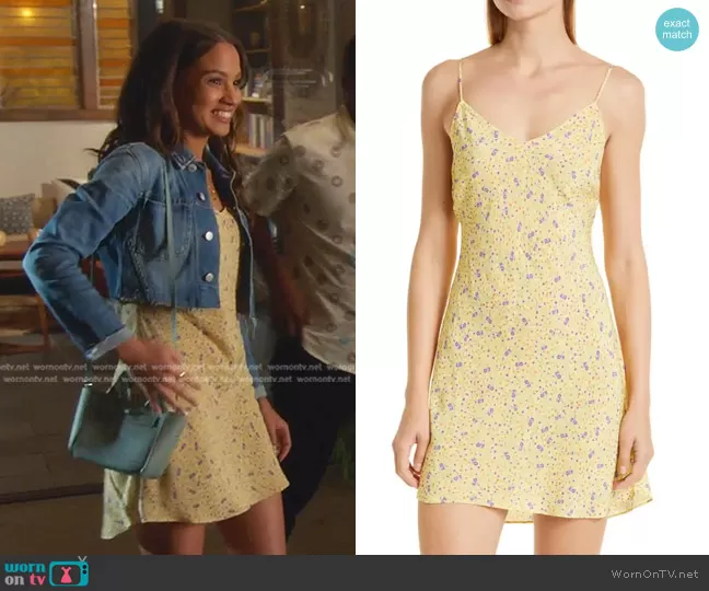 May Grant (played by Corinne Massiah) on 9-1-1 on ABC was spotted wearing this yellow floral mini dress and denim jacket on 9-1-1 on episode 'What's Your Fantasy?' (6x08) in Nov 2022. May's Dress is the The Drew Sundress by Favorite Daughter . May's Jacket is the Janelle Raw Cut Slim Denim Jacket by L'Agence . May's Necklace is the Toggle Chain Necklace Set by Madewell . May's Bag is the Mini Filippo Leather Tote by Yvonne Kone.