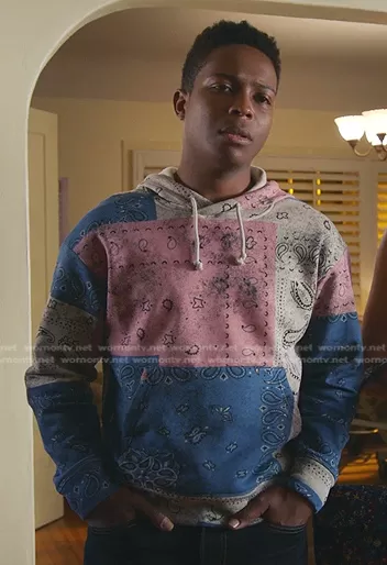 Darius (played by Dante Brown) on 9-1-1 on Fox was spotted wearing this bandana print hoodie on 9-1-1 on episode 'What's Your Fantasy?' (6x08) in Nov 2022. 's Sweater is the Oversize Bandana Print Fleece Hoodie by BP.