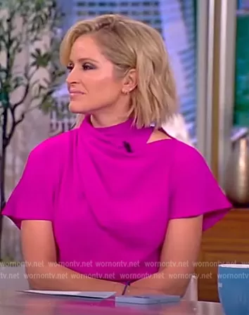Sara Haines on The View on ABC was spotted wearing this pink cutout jumpsuit on The View on Feb 14 2023's episode. Sara's Jumpsuit is the Estella High-Neck Jumpsuit by Black Halo.